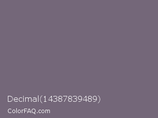 Decimal 14387839489 Color is a normal purple color and the nearest color is Old Lavender #796878. Hex code #746779 and RGB value is rgb(116,103,121). In RGB color space, this color is composed of 45% red, 40% green, 47% blue, In CMYK color space, this color is composed of 4% cyan, 15% magenta, 0% yellow , 53% black , In HSL color space, this color has a hue angle of 283° , 8% saturation and 44% lightness.