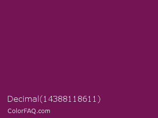 Decimal 14388118611 Color is a dark magenta color and the nearest color is Pansy Purple #78184a. Hex code #751455 and RGB value is rgb(117,20,85). In RGB color space, this color is composed of 46% red, 8% green, 33% blue, In CMYK color space, this color is composed of 0% cyan, 83% magenta, 27% yellow , 54% black , In HSL color space, this color has a hue angle of 320° , 71% saturation and 27% lightness.