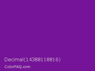 Decimal 14388118816 Color is a normal purple color and the nearest color is Seance #731e8f. Hex code #751498 and RGB value is rgb(117,20,152). In RGB color space, this color is composed of 46% red, 8% green, 60% blue, In CMYK color space, this color is composed of 23% cyan, 87% magenta, 0% yellow , 40% black , In HSL color space, this color has a hue angle of 284° , 77% saturation and 34% lightness.