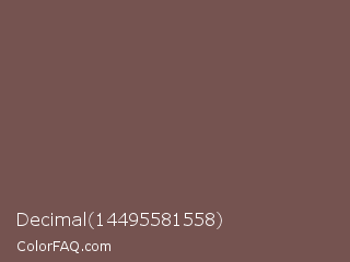 Decimal 14495581558 Color is a normal red color and the nearest color is Ferra #704f50. Hex code #755350 and RGB value is rgb(117,83,80). In RGB color space, this color is composed of 46% red, 33% green, 31% blue, In CMYK color space, this color is composed of 0% cyan, 29% magenta, 32% yellow , 54% black , In HSL color space, this color has a hue angle of 5° , 19% saturation and 39% lightness.