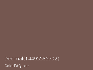 Decimal 14495585792 Color is a normal red color and the nearest color is Russett #755a57. Hex code #755750 and RGB value is rgb(117,87,80). In RGB color space, this color is composed of 46% red, 34% green, 31% blue, In CMYK color space, this color is composed of 0% cyan, 26% magenta, 32% yellow , 54% black , In HSL color space, this color has a hue angle of 11° , 19% saturation and 39% lightness.