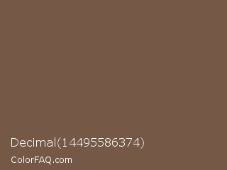 Decimal 14495586374 Color is a normal orange color and the nearest color is Tobacco Brown #715d47. Hex code #755846 and RGB value is rgb(117,88,70). In RGB color space, this color is composed of 46% red, 35% green, 27% blue, In CMYK color space, this color is composed of 0% cyan, 25% magenta, 40% yellow , 54% black , In HSL color space, this color has a hue angle of 23° , 25% saturation and 37% lightness.