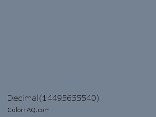 Decimal 14495655540 Color is a normal blue color and the nearest color is Slate Gray #708090. Hex code #758292 and RGB value is rgb(117,130,146). In RGB color space, this color is composed of 46% red, 51% green, 57% blue, In CMYK color space, this color is composed of 20% cyan, 11% magenta, 0% yellow , 43% black , In HSL color space, this color has a hue angle of 213° , 12% saturation and 52% lightness.