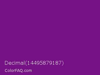 Decimal 14495879187 Color is a dark magenta color and the nearest color is Seance #731e8f. Hex code #761085 and RGB value is rgb(118,16,133). In RGB color space, this color is composed of 46% red, 6% green, 52% blue, In CMYK color space, this color is composed of 11% cyan, 88% magenta, 0% yellow , 48% black , In HSL color space, this color has a hue angle of 292° , 79% saturation and 29% lightness.