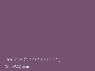 Decimal 14495996041 Color is a normal magenta color and the nearest color is Salt Box #685e6e. Hex code #765271 and RGB value is rgb(118,82,113). In RGB color space, this color is composed of 46% red, 32% green, 44% blue, In CMYK color space, this color is composed of 0% cyan, 31% magenta, 4% yellow , 54% black , In HSL color space, this color has a hue angle of 308° , 18% saturation and 39% lightness.