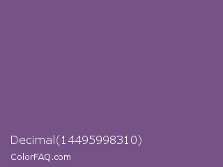Decimal 14495998310 Color is a normal purple color and the nearest color is Dark Lavender #734f96. Hex code #765386 and RGB value is rgb(118,83,134). In RGB color space, this color is composed of 46% red, 33% green, 53% blue, In CMYK color space, this color is composed of 12% cyan, 38% magenta, 0% yellow , 47% black , In HSL color space, this color has a hue angle of 281° , 24% saturation and 43% lightness.