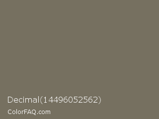 Decimal 14496052562 Color is a normal orange color and the nearest color is Pablo #776f61. Hex code #767060 and RGB value is rgb(118,112,96). In RGB color space, this color is composed of 46% red, 44% green, 38% blue, In CMYK color space, this color is composed of 0% cyan, 5% magenta, 19% yellow , 54% black , In HSL color space, this color has a hue angle of 44° , 10% saturation and 42% lightness.