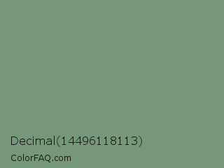 Decimal 14496118113 Color is a normal green color and the nearest color is Laurel #749378. Hex code #769779 and RGB value is rgb(118,151,121). In RGB color space, this color is composed of 46% red, 59% green, 47% blue, In CMYK color space, this color is composed of 22% cyan, 0% magenta, 20% yellow , 41% black , In HSL color space, this color has a hue angle of 125° , 14% saturation and 53% lightness.