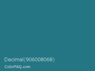 Decimal 906008068 Color is a normal cyan color and the nearest color is Elm #1c7c7d. Hex code #257684 and RGB value is rgb(37,118,132). In RGB color space, this color is composed of 15% red, 46% green, 52% blue, In CMYK color space, this color is composed of 72% cyan, 11% magenta, 0% yellow , 48% black , In HSL color space, this color has a hue angle of 189° , 56% saturation and 33% lightness.