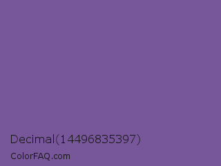 Decimal 14496835397 Color is a normal violet color and the nearest color is Dark Lavender #734f96. Hex code #775799 and RGB value is rgb(119,87,153). In RGB color space, this color is composed of 47% red, 34% green, 60% blue, In CMYK color space, this color is composed of 22% cyan, 43% magenta, 0% yellow , 40% black , In HSL color space, this color has a hue angle of 269° , 28% saturation and 47% lightness.