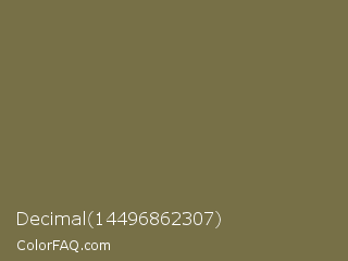 Decimal 14496862307 Color is a normal yellow color and the nearest color is Go Ben #726d4e. Hex code #777047 and RGB value is rgb(119,112,71). In RGB color space, this color is composed of 47% red, 44% green, 28% blue, In CMYK color space, this color is composed of 0% cyan, 6% magenta, 40% yellow , 53% black , In HSL color space, this color has a hue angle of 51° , 25% saturation and 37% lightness.