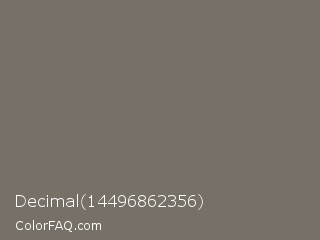 Decimal 14496862356 Color is a normal orange color and the nearest color is Pablo #776f61. Hex code #777066 and RGB value is rgb(119,112,102). In RGB color space, this color is composed of 47% red, 44% green, 40% blue, In CMYK color space, this color is composed of 0% cyan, 6% magenta, 14% yellow , 53% black , In HSL color space, this color has a hue angle of 35° , 8% saturation and 43% lightness.