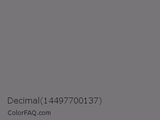Decimal 14497700137 Color is a normal purple color and the nearest color is Sonic Silver #757575. Hex code #787579 and RGB value is rgb(120,117,121). In RGB color space, this color is composed of 47% red, 46% green, 47% blue, In CMYK color space, this color is composed of 1% cyan, 3% magenta, 0% yellow , 53% black , In HSL color space, this color has a hue angle of 285° , 2% saturation and 47% lightness.