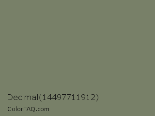 Decimal 14497711912 Color is a normal green color and the nearest color is Flax Smoke #7b8265. Hex code #788068 and RGB value is rgb(120,128,104). In RGB color space, this color is composed of 47% red, 50% green, 41% blue, In CMYK color space, this color is composed of 6% cyan, 0% magenta, 19% yellow , 50% black , In HSL color space, this color has a hue angle of 80° , 10% saturation and 45% lightness.