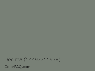 Decimal 14497711938 Color is a normal green color and the nearest color is Smoke #738276. Hex code #788076 and RGB value is rgb(120,128,118). In RGB color space, this color is composed of 47% red, 50% green, 46% blue, In CMYK color space, this color is composed of 6% cyan, 0% magenta, 8% yellow , 50% black , In HSL color space, this color has a hue angle of 108° , 4% saturation and 48% lightness.