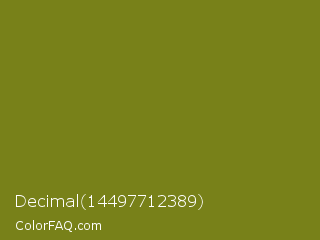 Decimal 14497712389 Color is a dark yellow color and the nearest color is Pacifika #778120. Hex code #788119 and RGB value is rgb(120,129,25). In RGB color space, this color is composed of 47% red, 51% green, 10% blue, In CMYK color space, this color is composed of 7% cyan, 0% magenta, 81% yellow , 49% black , In HSL color space, this color has a hue angle of 65° , 68% saturation and 30% lightness.