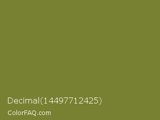 Decimal 14497712425 Color is a normal yellow color and the nearest color is Pesto #7c7631. Hex code #788131 and RGB value is rgb(120,129,49). In RGB color space, this color is composed of 47% red, 51% green, 19% blue, In CMYK color space, this color is composed of 7% cyan, 0% magenta, 62% yellow , 49% black , In HSL color space, this color has a hue angle of 67° , 45% saturation and 35% lightness.