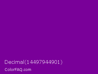 Decimal 14497944901 Color is a dark purple color and the nearest color is Purple #660099. Hex code #790099 and RGB value is rgb(121,0,153). In RGB color space, this color is composed of 47% red, 0% green, 60% blue, In CMYK color space, this color is composed of 21% cyan, 100% magenta, 0% yellow , 40% black , In HSL color space, this color has a hue angle of 287° , 100% saturation and 30% lightness.