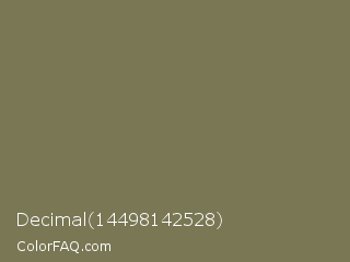 Decimal 14498142528 Color is a normal yellow color and the nearest color is Crocodile #736d58. Hex code #797754 and RGB value is rgb(121,119,84). In RGB color space, this color is composed of 47% red, 47% green, 33% blue, In CMYK color space, this color is composed of 0% cyan, 2% magenta, 31% yellow , 53% black , In HSL color space, this color has a hue angle of 57° , 18% saturation and 40% lightness.