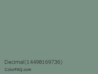 Decimal 14498169736 Color is a normal green color and the nearest color is Dolphin Gray #828e84. Hex code #799084 and RGB value is rgb(121,144,132). In RGB color space, this color is composed of 47% red, 56% green, 52% blue, In CMYK color space, this color is composed of 16% cyan, 0% magenta, 8% yellow , 44% black , In HSL color space, this color has a hue angle of 149° , 9% saturation and 52% lightness.