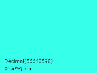 Decimal 56640598 Color is a light cyan color and the nearest color is Turquoise #40e0d0. Hex code #36ffe8 and RGB value is rgb(54,255,232). In RGB color space, this color is composed of 21% red, 100% green, 91% blue, In CMYK color space, this color is composed of 79% cyan, 0% magenta, 9% yellow , 0% black , In HSL color space, this color has a hue angle of 173° , 100% saturation and 61% lightness.