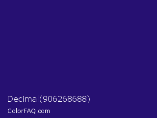 Decimal 906268688 Color is a dark indigo color and the nearest color is Deep Blue #220878. Hex code #261072 and RGB value is rgb(38,16,114). In RGB color space, this color is composed of 15% red, 6% green, 45% blue, In CMYK color space, this color is composed of 67% cyan, 86% magenta, 0% yellow , 55% black , In HSL color space, this color has a hue angle of 253° , 75% saturation and 25% lightness.