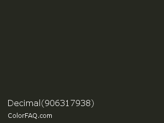 Decimal 906317938 Color is a very dark lime color and the nearest color is Log Cabin #242a1d. Hex code #262820 and RGB value is rgb(38,40,32). In RGB color space, this color is composed of 15% red, 16% green, 13% blue, In CMYK color space, this color is composed of 5% cyan, 0% magenta, 20% yellow , 84% black , In HSL color space, this color has a hue angle of 75° , 11% saturation and 14% lightness.