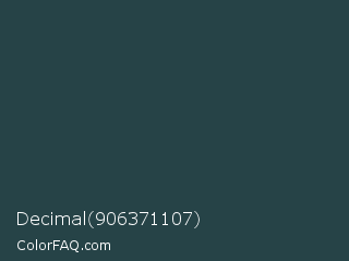 Decimal 906371107 Color is a very dark cyan color and the nearest color is Japanese Indigo #264348. Hex code #264347 and RGB value is rgb(38,67,71). In RGB color space, this color is composed of 15% red, 26% green, 28% blue, In CMYK color space, this color is composed of 46% cyan, 6% magenta, 0% yellow , 72% black , In HSL color space, this color has a hue angle of 187° , 30% saturation and 21% lightness.