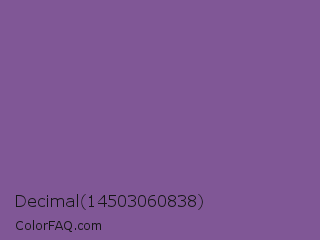 Decimal 14503060838 Color is a normal purple color and the nearest color is French Lilac #86608e. Hex code #805796 and RGB value is rgb(128,87,150). In RGB color space, this color is composed of 50% red, 34% green, 59% blue, In CMYK color space, this color is composed of 15% cyan, 42% magenta, 0% yellow , 41% black , In HSL color space, this color has a hue angle of 279° , 27% saturation and 46% lightness.