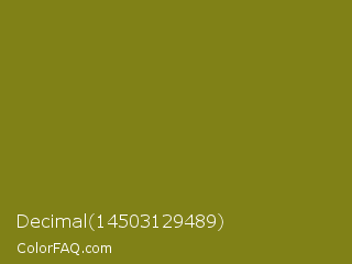 Decimal 14503129489 Color is a dark yellow color and the nearest color is Trendy Green #7c881a. Hex code #808117 and RGB value is rgb(128,129,23). In RGB color space, this color is composed of 50% red, 51% green, 9% blue, In CMYK color space, this color is composed of 1% cyan, 0% magenta, 82% yellow , 49% black , In HSL color space, this color has a hue angle of 61° , 70% saturation and 30% lightness.