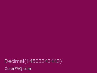 Decimal 14503343443 Color is a dark magenta color and the nearest color is Rose Bud Cherry #800b47. Hex code #810751 and RGB value is rgb(129,7,81). In RGB color space, this color is composed of 51% red, 3% green, 32% blue, In CMYK color space, this color is composed of 0% cyan, 95% magenta, 37% yellow , 49% black , In HSL color space, this color has a hue angle of 324° , 90% saturation and 27% lightness.