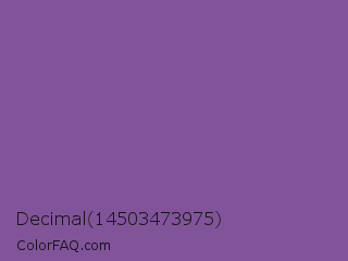 Decimal 14503473975 Color is a normal purple color and the nearest color is Dark Lavender #734f96. Hex code #815499 and RGB value is rgb(129,84,153). In RGB color space, this color is composed of 51% red, 33% green, 60% blue, In CMYK color space, this color is composed of 16% cyan, 45% magenta, 0% yellow , 40% black , In HSL color space, this color has a hue angle of 279° , 29% saturation and 46% lightness.