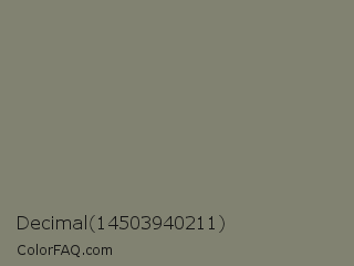 Decimal 14503940211 Color is a normal yellow color and the nearest color is Bandicoot #858470. Hex code #818271 and RGB value is rgb(129,130,113). In RGB color space, this color is composed of 51% red, 51% green, 44% blue, In CMYK color space, this color is composed of 1% cyan, 0% magenta, 13% yellow , 49% black , In HSL color space, this color has a hue angle of 64° , 7% saturation and 48% lightness.
