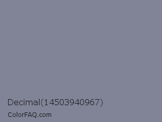 Decimal 14503940967 Color is a normal blue color and the nearest color is Roman Silver #838996. Hex code #818397 and RGB value is rgb(129,131,151). In RGB color space, this color is composed of 51% red, 51% green, 59% blue, In CMYK color space, this color is composed of 15% cyan, 13% magenta, 0% yellow , 41% black , In HSL color space, this color has a hue angle of 235° , 10% saturation and 55% lightness.