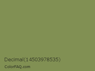 Decimal 14503978535 Color is a normal lime color and the nearest color is Moss Green #8a9a5b. Hex code #819053 and RGB value is rgb(129,144,83). In RGB color space, this color is composed of 51% red, 56% green, 33% blue, In CMYK color space, this color is composed of 10% cyan, 0% magenta, 42% yellow , 44% black , In HSL color space, this color has a hue angle of 75° , 27% saturation and 45% lightness.