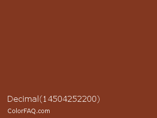 Decimal 14504252200 Color is a normal red color and the nearest color is Red Robin #80341f. Hex code #823720 and RGB value is rgb(130,55,32). In RGB color space, this color is composed of 51% red, 22% green, 13% blue, In CMYK color space, this color is composed of 0% cyan, 58% magenta, 75% yellow , 49% black , In HSL color space, this color has a hue angle of 14° , 60% saturation and 32% lightness.