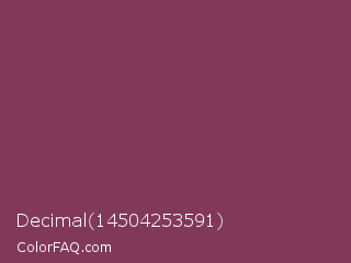 Decimal 14504253591 Color is a normal rose color and the nearest color is Deep Ruby #843f5b. Hex code #823959 and RGB value is rgb(130,57,89). In RGB color space, this color is composed of 51% red, 22% green, 35% blue, In CMYK color space, this color is composed of 0% cyan, 56% magenta, 32% yellow , 49% black , In HSL color space, this color has a hue angle of 334° , 39% saturation and 37% lightness.