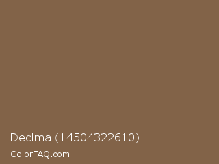 Decimal 14504322610 Color is a normal orange color and the nearest color is Raw Umber #826644. Hex code #826348 and RGB value is rgb(130,99,72). In RGB color space, this color is composed of 51% red, 39% green, 28% blue, In CMYK color space, this color is composed of 0% cyan, 24% magenta, 45% yellow , 49% black , In HSL color space, this color has a hue angle of 28° , 29% saturation and 40% lightness.
