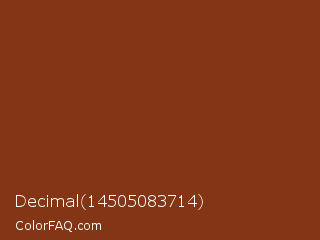 Decimal 14505083714 Color is a dark orange color and the nearest color is Copper Canyon #7e3a15. Hex code #833516 and RGB value is rgb(131,53,22). In RGB color space, this color is composed of 51% red, 21% green, 9% blue, In CMYK color space, this color is composed of 0% cyan, 60% magenta, 83% yellow , 49% black , In HSL color space, this color has a hue angle of 17° , 71% saturation and 30% lightness.