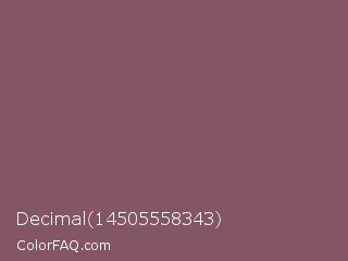 Decimal 14505558343 Color is a normal rose color and the nearest color is Deep Taupe #7e5e60. Hex code #845563 and RGB value is rgb(132,85,99). In RGB color space, this color is composed of 52% red, 33% green, 39% blue, In CMYK color space, this color is composed of 0% cyan, 36% magenta, 25% yellow , 48% black , In HSL color space, this color has a hue angle of 342° , 22% saturation and 43% lightness.