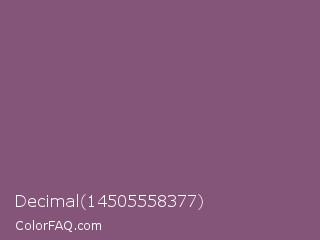 Decimal 14505558377 Color is a normal magenta color and the nearest color is Sugar Plum #914e75. Hex code #845579 and RGB value is rgb(132,85,121). In RGB color space, this color is composed of 52% red, 33% green, 47% blue, In CMYK color space, this color is composed of 0% cyan, 36% magenta, 8% yellow , 48% black , In HSL color space, this color has a hue angle of 314° , 22% saturation and 43% lightness.