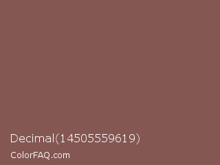 Decimal 14505559619 Color is a normal red color and the nearest color is Spicy Mix #8b5f4d. Hex code #845753 and RGB value is rgb(132,87,83). In RGB color space, this color is composed of 52% red, 34% green, 33% blue, In CMYK color space, this color is composed of 0% cyan, 34% magenta, 37% yellow , 48% black , In HSL color space, this color has a hue angle of 5° , 23% saturation and 42% lightness.