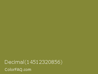 Decimal 14512320856 Color is a normal yellow color and the nearest color is Old Moss Green #867e36. Hex code #848836 and RGB value is rgb(132,136,54). In RGB color space, this color is composed of 52% red, 53% green, 21% blue, In CMYK color space, this color is composed of 3% cyan, 0% magenta, 60% yellow , 47% black , In HSL color space, this color has a hue angle of 63° , 43% saturation and 37% lightness.