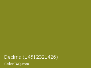 Decimal 14512321426 Color is a normal yellow color and the nearest color is Trendy Green #7c881a. Hex code #848920 and RGB value is rgb(132,137,32). In RGB color space, this color is composed of 52% red, 54% green, 13% blue, In CMYK color space, this color is composed of 4% cyan, 0% magenta, 77% yellow , 46% black , In HSL color space, this color has a hue angle of 63° , 62% saturation and 33% lightness.