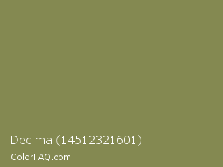 Decimal 14512321601 Color is a normal yellow color and the nearest color is Dark Tan #918151. Hex code #848951 and RGB value is rgb(132,137,81). In RGB color space, this color is composed of 52% red, 54% green, 32% blue, In CMYK color space, this color is composed of 4% cyan, 0% magenta, 41% yellow , 46% black , In HSL color space, this color has a hue angle of 65° , 26% saturation and 43% lightness.