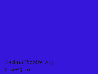 Decimal 56689457 Color is a normal indigo color and the nearest color is Interdimensional Blue #360ccc. Hex code #3716db and RGB value is rgb(55,22,219). In RGB color space, this color is composed of 22% red, 9% green, 86% blue, In CMYK color space, this color is composed of 75% cyan, 90% magenta, 0% yellow , 14% black , In HSL color space, this color has a hue angle of 250° , 82% saturation and 47% lightness.
