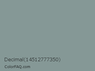 Decimal 14512777350 Color is a normal cyan color and the nearest color is Mantle #8b9c90. Hex code #859896 and RGB value is rgb(133,152,150). In RGB color space, this color is composed of 52% red, 60% green, 59% blue, In CMYK color space, this color is composed of 13% cyan, 0% magenta, 1% yellow , 40% black , In HSL color space, this color has a hue angle of 174° , 8% saturation and 56% lightness.