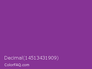 Decimal 14513431909 Color is a normal purple color and the nearest color is Vivid Violet #803790. Hex code #863395 and RGB value is rgb(134,51,149). In RGB color space, this color is composed of 53% red, 20% green, 58% blue, In CMYK color space, this color is composed of 10% cyan, 66% magenta, 0% yellow , 42% black , In HSL color space, this color has a hue angle of 291° , 49% saturation and 39% lightness.