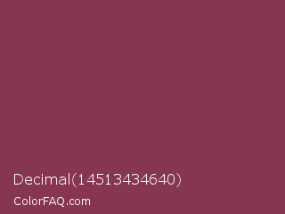 Decimal 14513434640 Color is a normal rose color and the nearest color is Camelot #893456. Hex code #863552 and RGB value is rgb(134,53,82). In RGB color space, this color is composed of 53% red, 21% green, 32% blue, In CMYK color space, this color is composed of 0% cyan, 60% magenta, 39% yellow , 47% black , In HSL color space, this color has a hue angle of 339° , 43% saturation and 37% lightness.