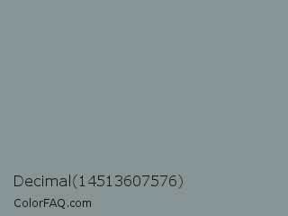 Decimal 14513607576 Color is a normal cyan color and the nearest color is Oslo Gray #878d91. Hex code #869496 and RGB value is rgb(134,148,150). In RGB color space, this color is composed of 53% red, 58% green, 59% blue, In CMYK color space, this color is composed of 11% cyan, 1% magenta, 0% yellow , 41% black , In HSL color space, this color has a hue angle of 188° , 7% saturation and 56% lightness.